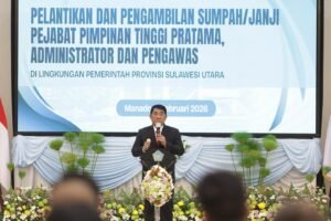DFACTONEWS.COM,MANADO — Gubernur Sulawesi Utara, Yulius Selvanus, resmi mengukuhkan dan melantik 62 pejabat tinggi pratama, administrator, dan pengawas eselon II, III, dan IV di Wisma Negara Bumi Beringin, Manado, Senin (9/2/2026).