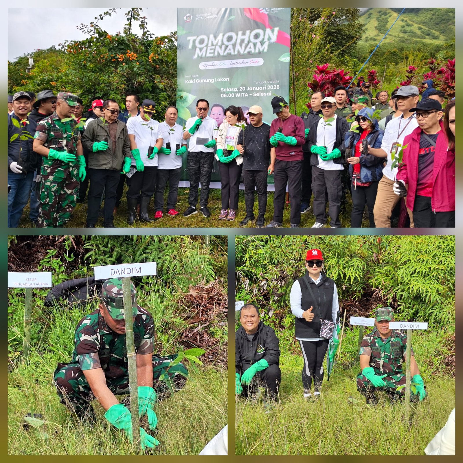 Penanaman pohon dipimpin Wali Kota Tomohon Caroll J.A. Senduk, S.H., bersama unsur Forkopimda, termasuk Danramil 02/Eris Kapten Inf Farisnop Ompoeo yang secara aktif mengikuti penanaman sebagai wujud peran TNI dalam mendukung program lingkungan hidup.