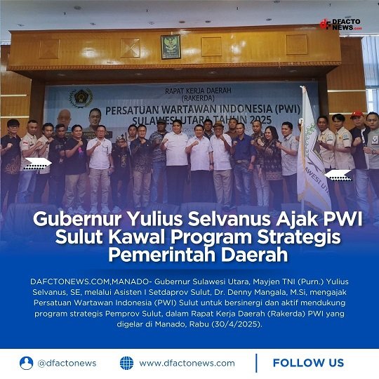 DAFCTONEWS.COM,MANADO– Gubernur Sulawesi Utara, Mayjen TNI (Purn.) Yulius Selvanus, SE, melalui Asisten I Setdaprov Sulut, Dr. Denny Mangala, M.Si, mengajak Persatuan Wartawan Indonesia (PWI) Sulut untuk bersinergi dan aktif mendukung program strategis Pemprov Sulut, dalam Rapat Kerja Daerah (Rakerda) PWI yang digelar di Manado, Rabu (30/4/2025).
