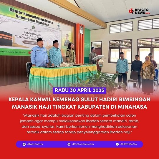DFACTONEWS.COM,MINAHASA-Kepala Kantor Wilayah Kementerian Agama Provinsi Sulawesi Utara, Drs. H. Ulyas Taha, M.Pd, menghadiri kegiatan Bimbingan Manasik Haji Tingkat Kabupaten yang diselenggarakan di Aula Kantor Kementerian Agama Kabupaten Minahasa, Rabu (30/04/2025).
