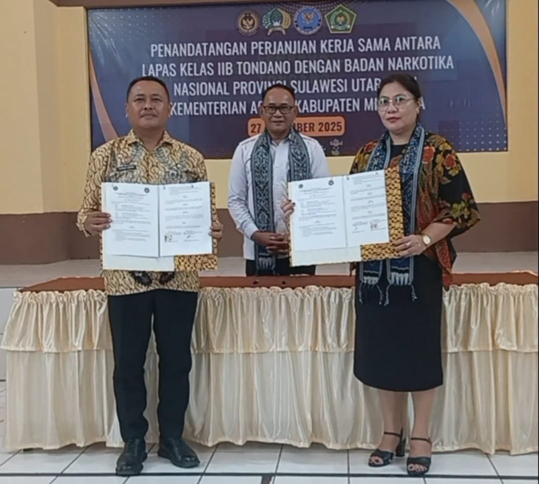 DFACTONEWS.COM,Tondano — Lembaga Pemasyarakatan (Lapas) Kelas IIB Tondano memperkuat strategi pencegahan peredaran narkotika sekaligus peningkatan pembinaan keagamaan bagi warga binaan. Upaya itu diwujudkan melalui penandatanganan nota kesepahaman (MoU) dengan Badan Narkotika Nasional (BNN) Provinsi Sulawesi Utara dan Kementerian Agama Kabupaten Minahasa, Kamis (27/11/2025).