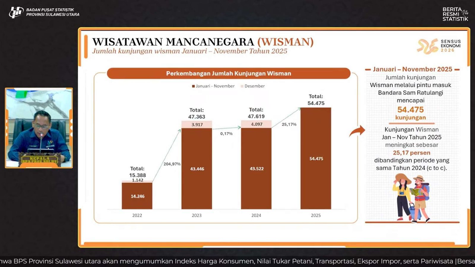 Kepala BPS Sulut, Aidil Adha, mengungkapkan bahwa secara tahunan capaian tersebut mengalami lonjakan signifikan. Dibandingkan November 2024, kunjungan wisman pada November 2025 meningkat hingga 63,31 persen, menandakan pemulihan pariwisata yang semakin solid.