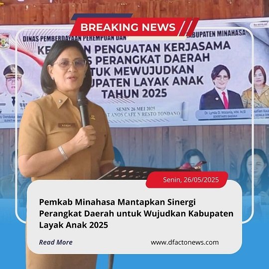 DFACTONEWS.COM,MINAHASA-Pemerintah Kabupaten Minahasa, melalui Dinas Pemberdayaan Perempuan dan Perlindungan Anak (DP3A), menggelar kegiatan Penguatan Kerja Sama Lintas Perangkat Daerah untuk Mewujudkan Kabupaten Layak Anak (KLA) Tahun 2025, dan dibuka langsung oleh Sekretaris Daerah Kabupaten Minahasa, Dr. Lynda Deasy Watania, mewakili Bupati Minahasa Robby Dondokambey, S.Si., M.Si. bertempat di Resto Anos, Senin (26/5/2025).