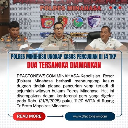 DFACTONEWS.COM,MINAHASA-Kepolisian Resor (Polres) Minahasa berhasil mengungkap kasus dugaan tindak pidana pencurian yang terjadi di sejumlah wilayah hukum Polres Minahasa. Hal ini disampaikan dalam konferensi pers yang digelar pada Rabu (21/5/2025) di Ruang TriBrata Mapolres Minahasa.