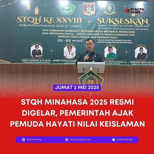 DFACTONEWS.COM,MINAHASA — Seleksi Tilawatil Qur’an dan Hadits (STQH) ke-XXVIII Tingkat Kabupaten Minahasa resmi dibuka, bertempat di Aula Kantor Kementerian Agama Kabupaten Minahasa. Kegiatan ini dibuka secara resmi oleh Asisten I Sekretariat Daerah Kabupaten Minahasa, Drs. Raviva Maringka, yang hadir mewakili Bupati Minahasa.Jumat (2/5/2025)