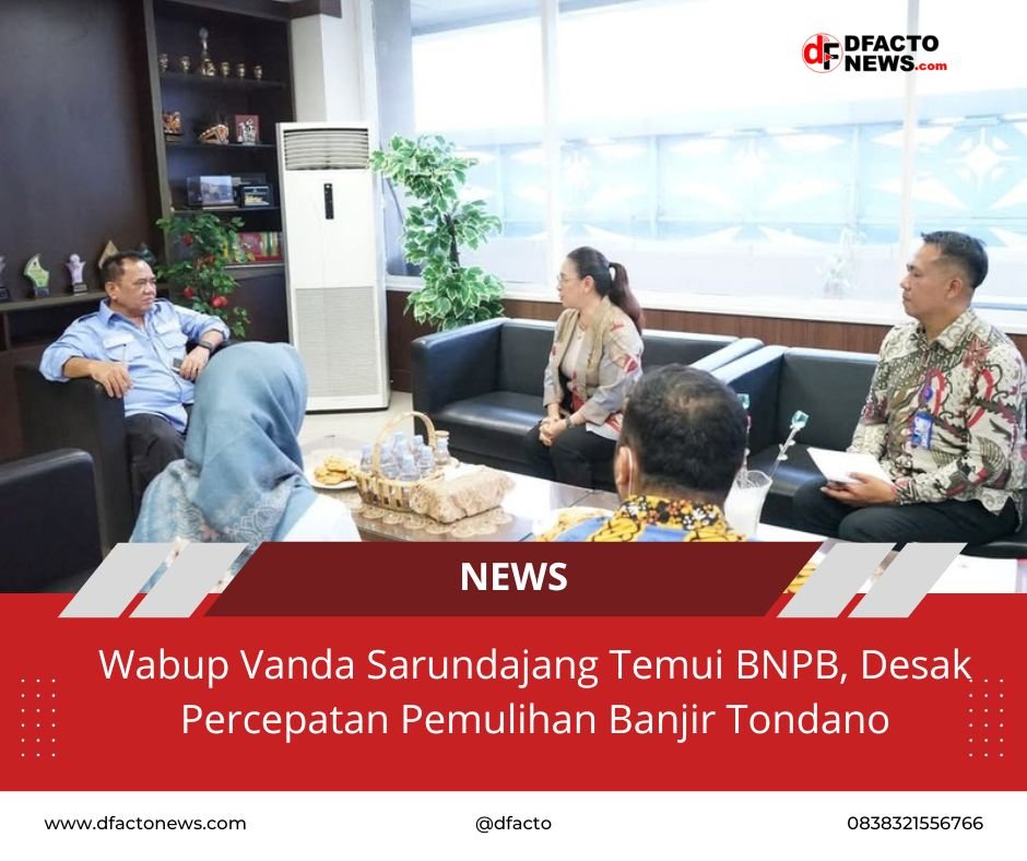 DFACTONEWS.COM,JAKARTA – Wakil Bupati Minahasa, Vanda Sarundajang, melakukan langkah cepat dalam upaya percepatan pemulihan pasca banjir yang melanda wilayah pesisir Danau Tondano dengan mengunjungi langsung Badan Nasional Penanggulangan Bencana (BNPB RI) di Jakarta, Selasa (10/6). Kunjungan ini dilaksanakan atas arahan langsung Bupati Minahasa, Robby Dondokambey.